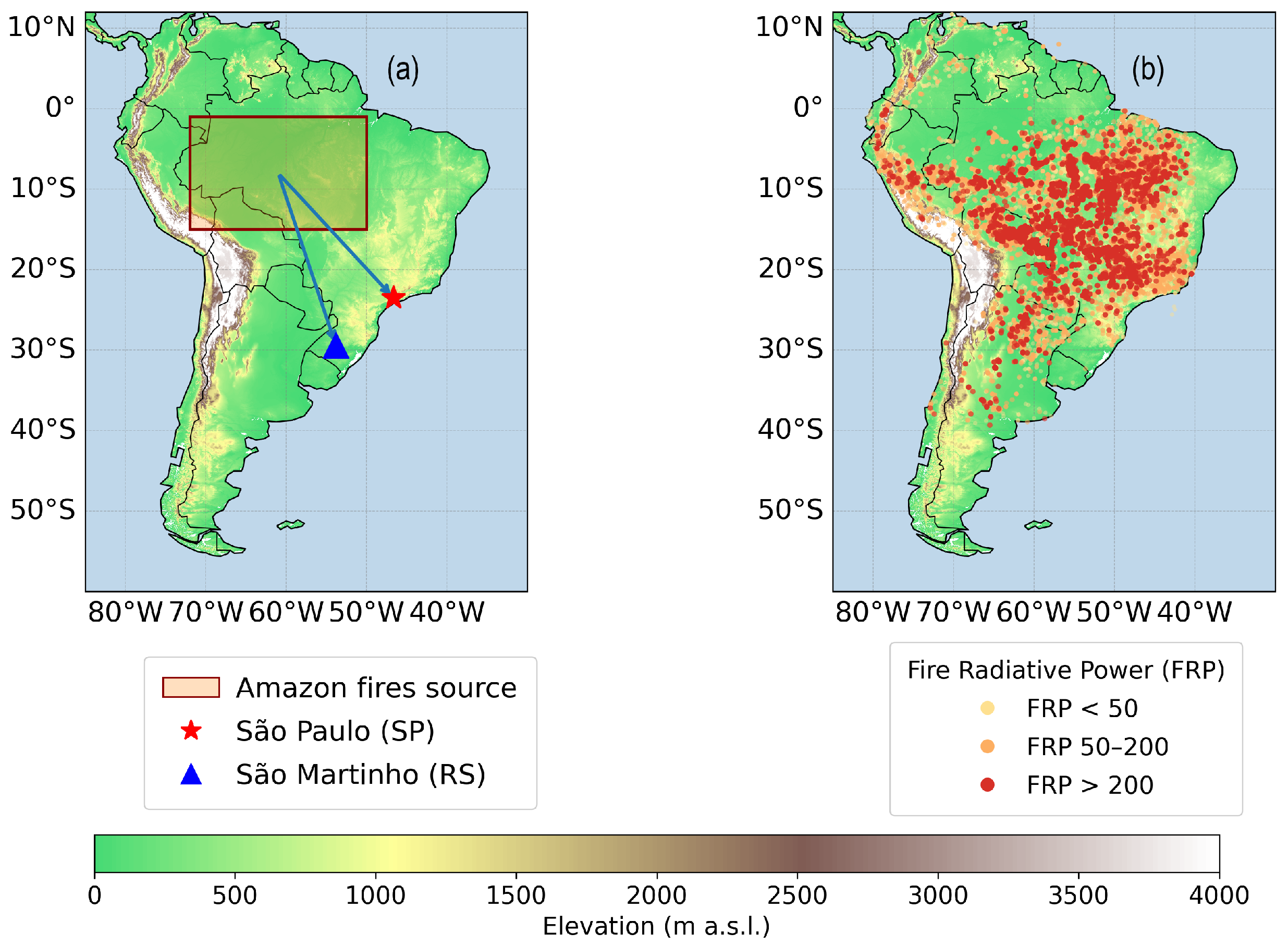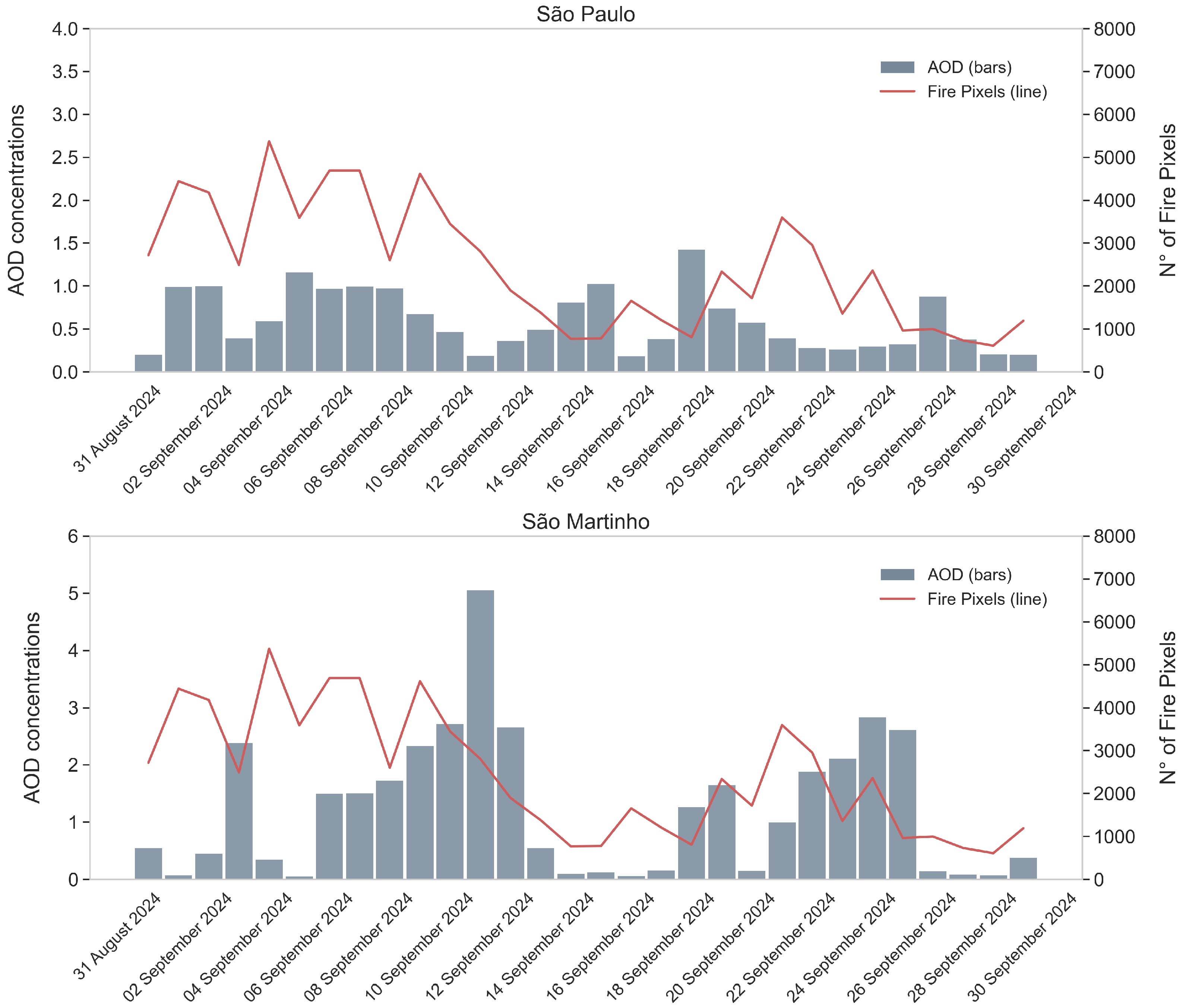 3.1. Fire Occurrence and Total AOD Concentrations During Events over São Paulo and São Martinho
