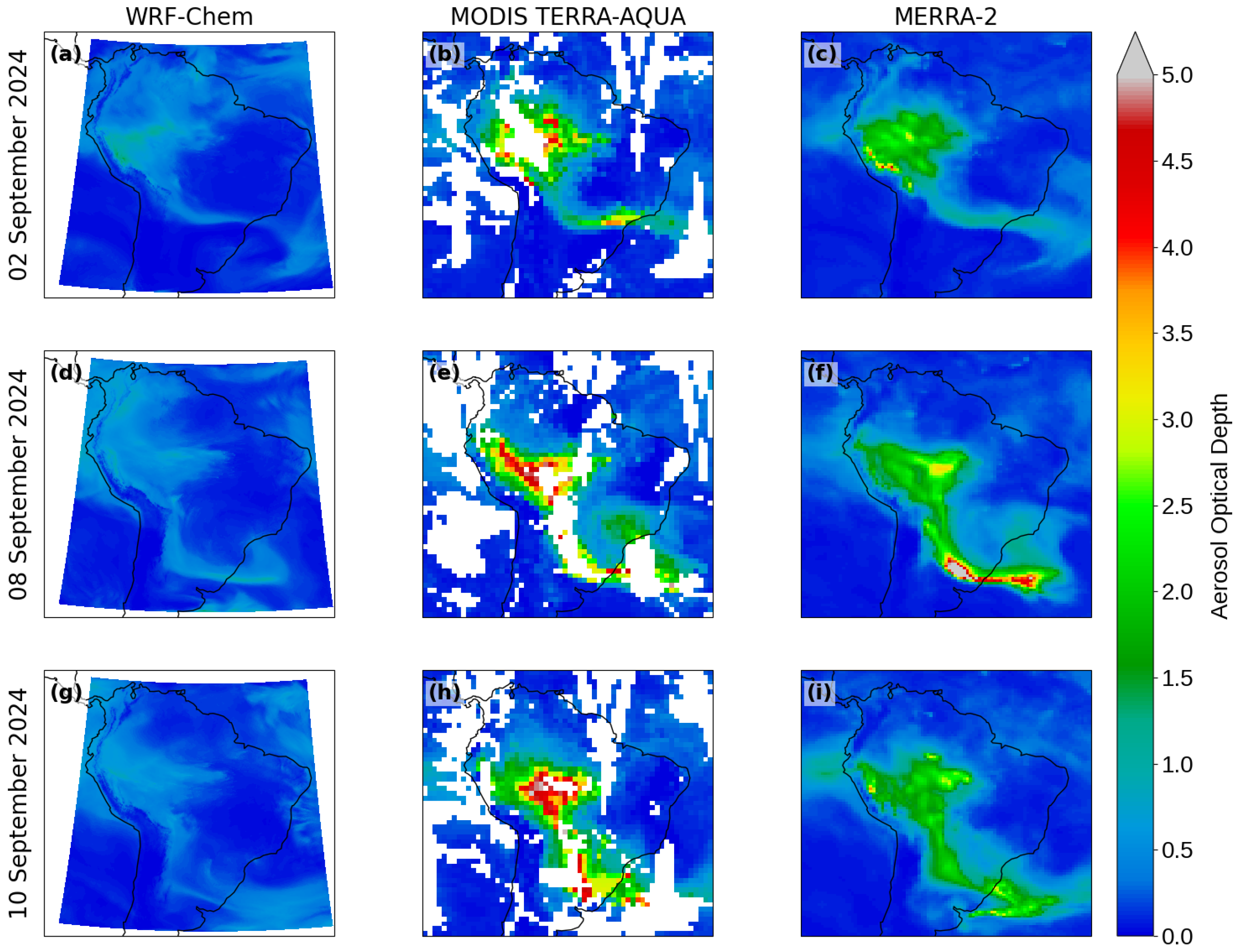 - Bresciani, C.; Herdies, D.L.; Figueroa, S.N.; Buchard, V.; da Silva, A.M.; Jones, C.; Carvalho, L.M.V. The South American Tropopause Aerosol Layer (SATAL). Bull. Am. Meteorol. Soc. 2024, 105, E176–E192. [Google Scholar] [CrossRef]
