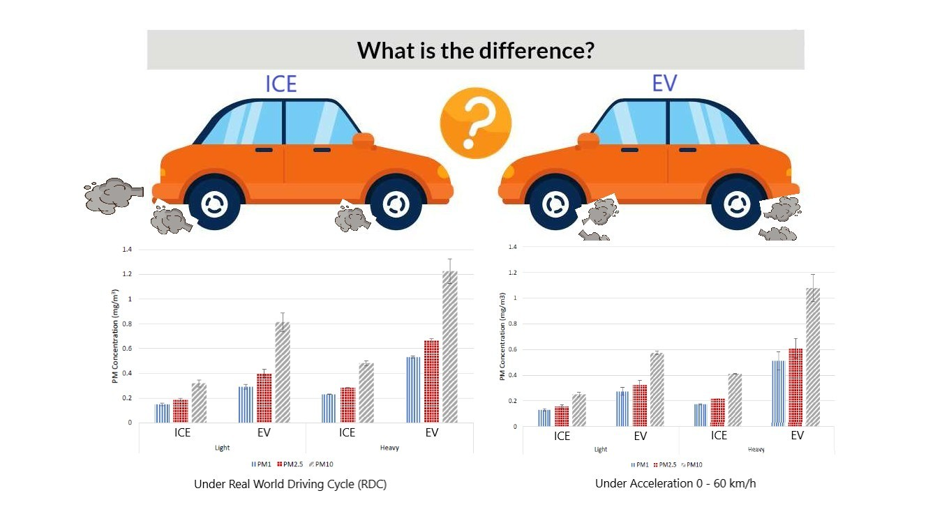 - The study confirms that increased vehicle weight directly contributes to elevated PM emissions. As such, exploring vehicle lightweighting strategies is recommended to mitigate non-exhaust PM emissions. Additionally, while EV offers environmental benefits by reducing tailpipe emissions, this study highlights that they may generate more non-exhaust PM than ICEV due to their heavier weight and higher torque. This finding suggests the need for future regulatory measures addressing non-exhaust emissions from EV.