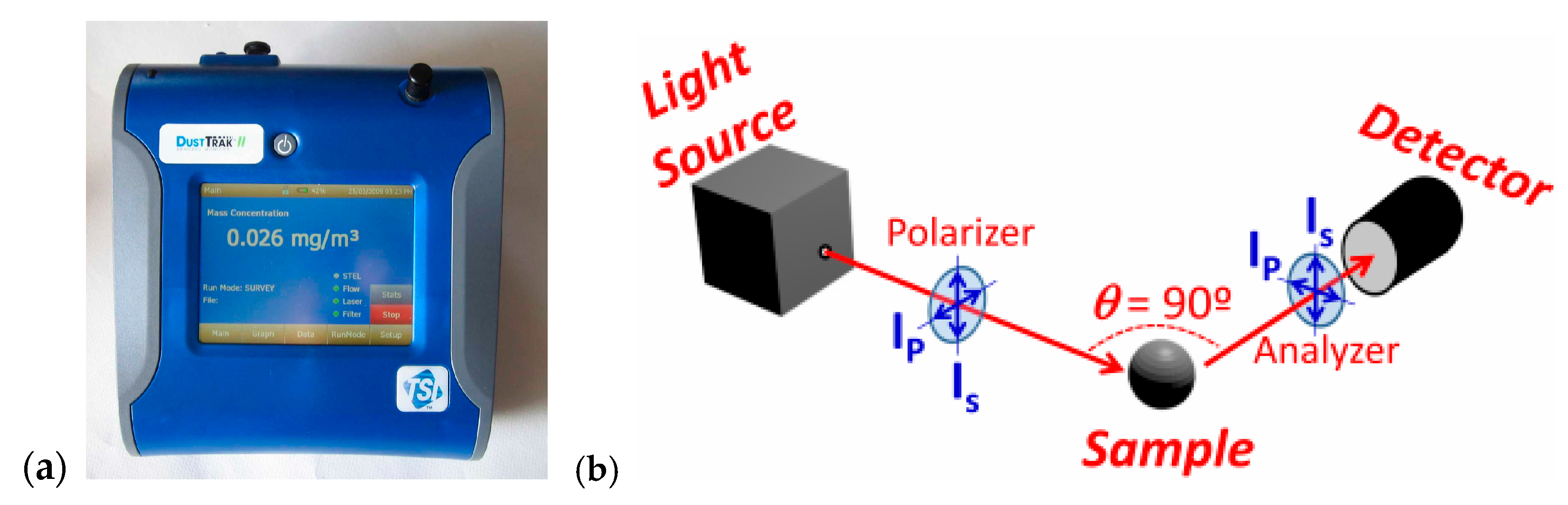 - TSI Incorporated. DustTrak DRX Aerosol Monitor 8533 User Manual. 2020. Available online: https://tsi.com/products/aerosol-and-dust-monitors/aerosol-and-dust-monitors/dusttrak%E2%84%A2-drx-aerosol-monitor-8533 (accessed on 24 September 2025).