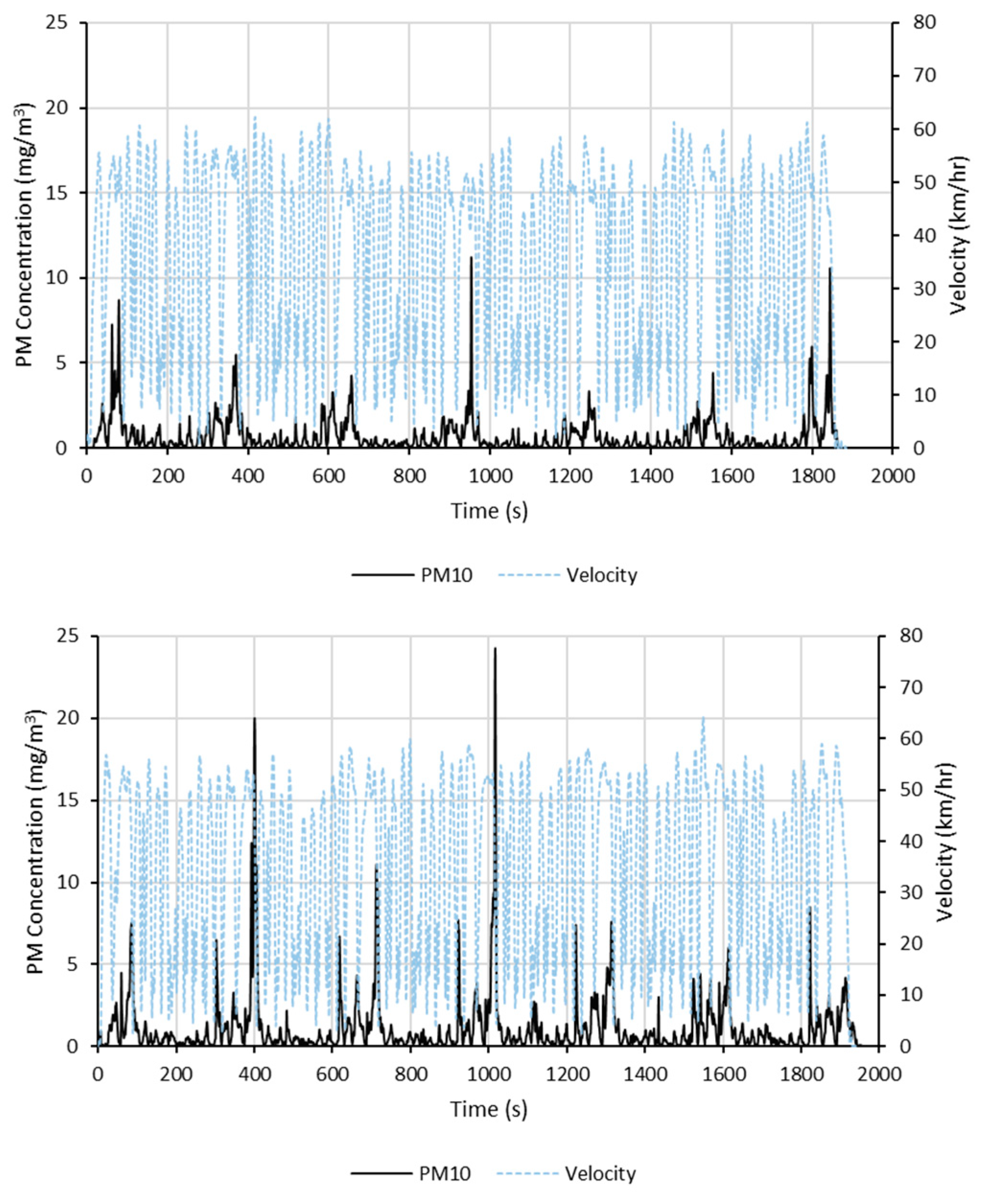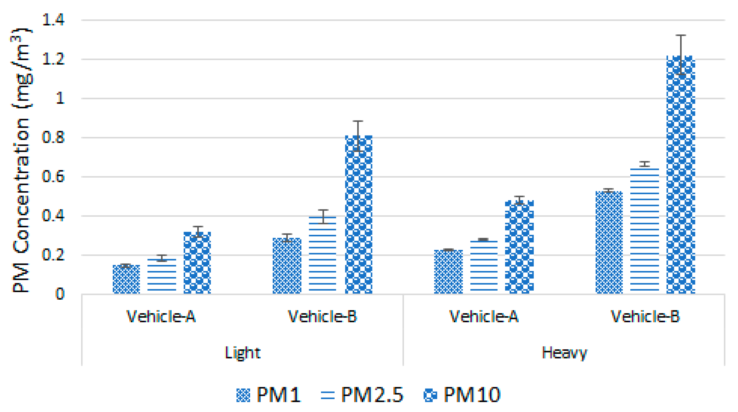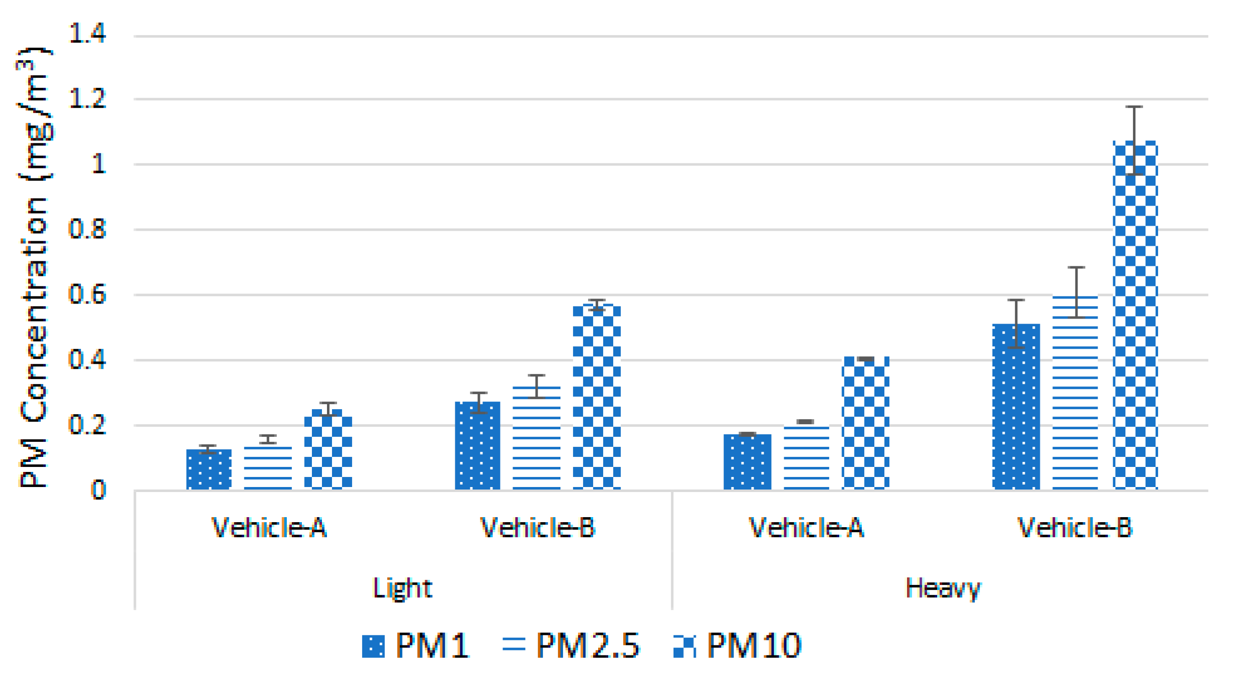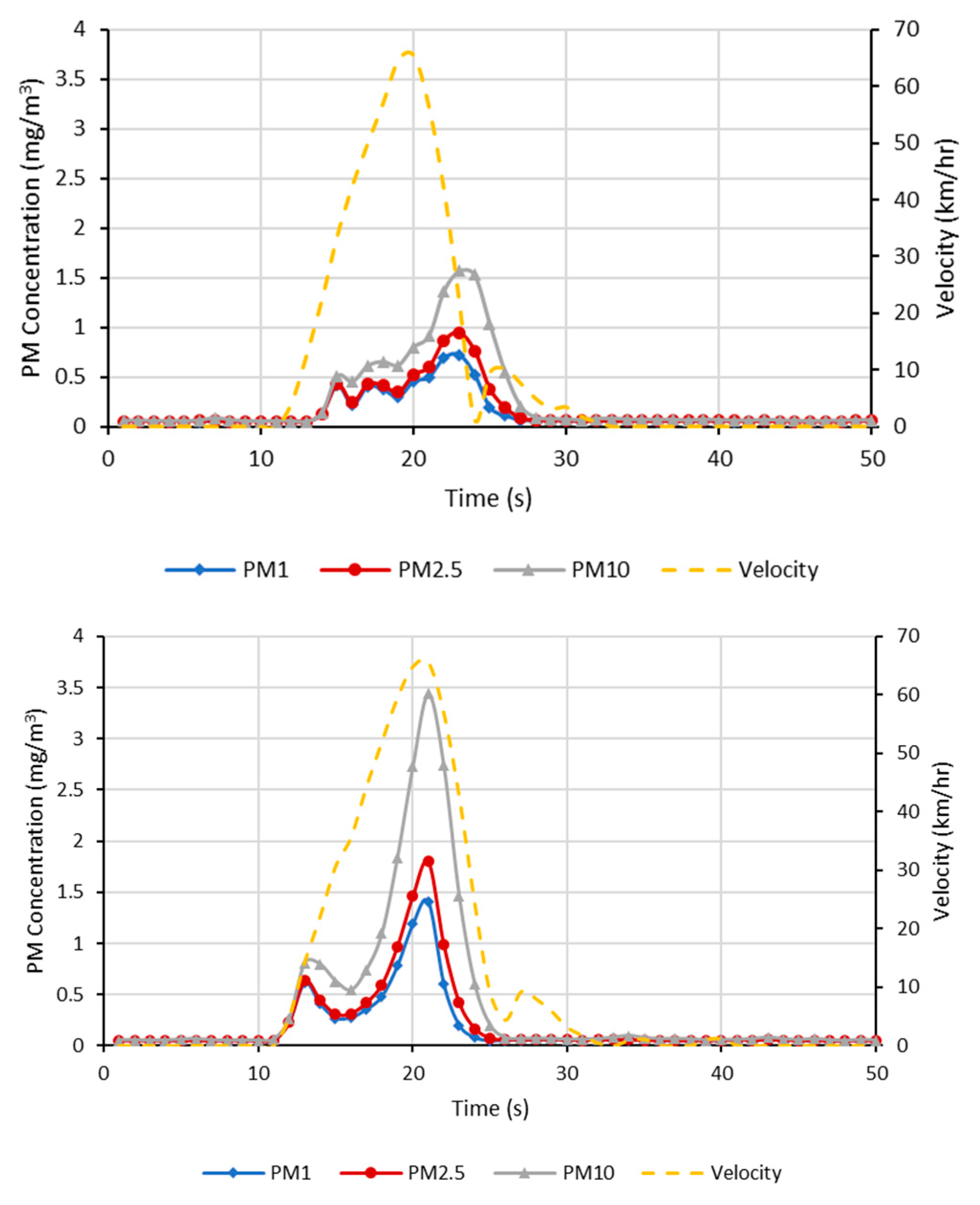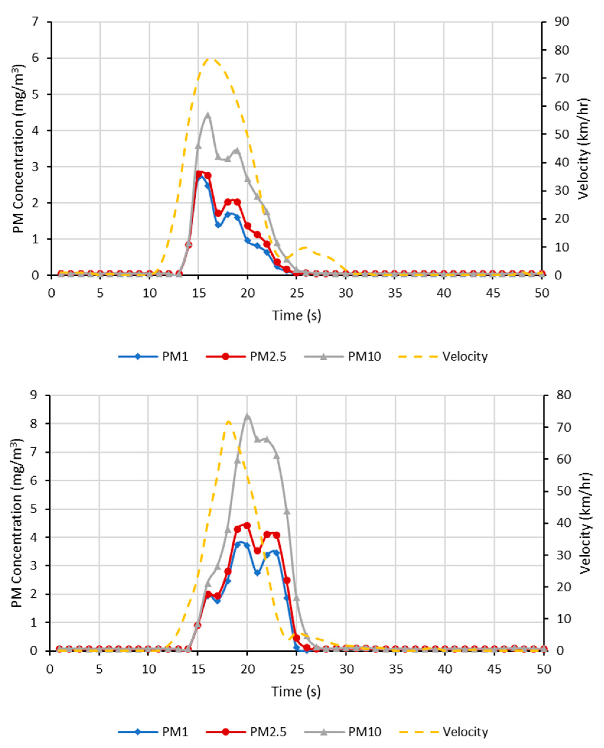 - Under identical vehicle weight conditions, EV demonstrated higher levels of PM dust resuspension than ICEV. This is likely due to the higher torque of the EV powertrain, which results in more immediate power delivery and increased friction between the tires and the road, particularly during rapid acceleration;