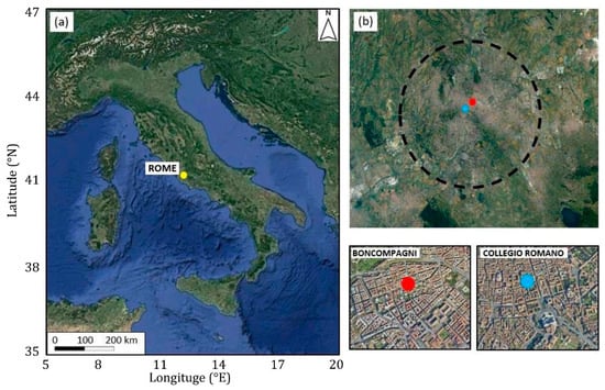 (a) Geographical map of Italy: the yellow marker identifies the city of Rome. (b) Expansion of Rome (delimited by the black dashed circle) and its surroundings, with the red and cyan markers identifying the Boncompagni and Collegio Romano sites, respectively.