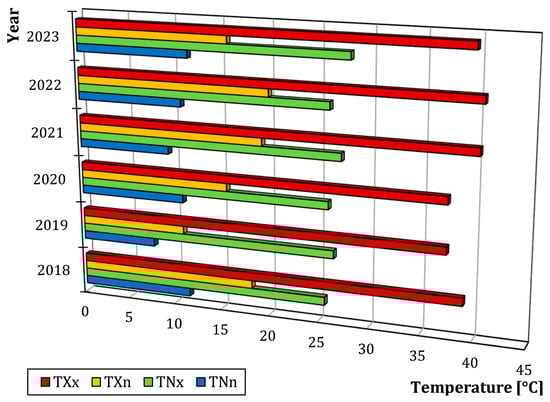 TNn was greater than 10 °C, except in 2019 and 2021. It peaked in 2023 (equal to 11.7 °C), while in 2019, it did not even reach 8 °C. TNx was greater than 25 °C, with a peak in 2023 (28 °C), followed by 2021, with approximately 27 °C. TXn showed a significant increase, ranging between approximately 11 °C in 2019 and 20 °C in 2022. TXx was around 37 °C in 2019 and 2020, while it was around 40 °C in the last three years (2021–2023), with a peak of 40.5 °C in 2022. In the year 2018, it was about 39 °C. It can be summarized that 2019 presents the minimum levels of temperatures (TNn and TXn) in the period examined, while the maximum levels (TNx and TXx) are similar to other years. Similarly, the last three years (2021–2023) present characteristics of “extreme” years, both from the point of view of minimum temperatures, i.e., TNn and TNx (especially the year 2023), and that of maximum temperatures, i.e., TXn and TXx (especially the year 2022).