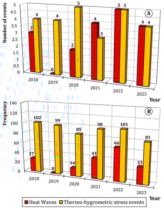 (A) Number of heat waves and outdoor human thermal stress events detected in the years 2018–2023. (B) Frequency of events in (A).