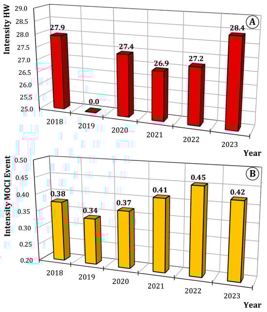 Intensity of events detected in the years 2018–2023: (A) heat waves and (B) outdoor human thermal stress events.