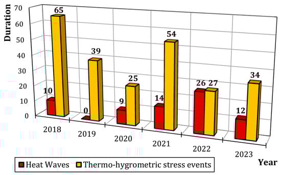 Duration of heat waves and outdoor human thermal stress events during the years 2018–2023.