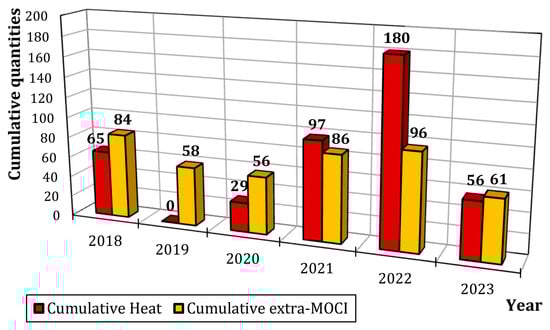Excluding the year 2019, during which no HWs occurred, the cumulative heat range (Figure 6) is from 29 (in the year 2020) to 180 (in the year 2022). The years 2023, 2018, and 2021 have intermediate and increasing values, equal to 56, 65, and 97, respectively. The extreme values of cumulative extra-MOCI also occurred in 2020 (the minimum, equal to 56) and in 2022 (the maximum, equal to 96). However, the range between the maximum and minimum value of this quantity is narrower than that of the cumulative heat, and the differences between the values of the different years are smaller. The cumulative extra-MOCI is equal to, in increasing order, 58 in 2019, 61 in 2023, 84 in 2018, and 86 in 2021.