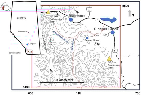 A paired “exposed versus control” study was designed using moss in bags to assess whether pollutant emissions (δ34Sa ~+18‰) throughout the relatively remote southern Alberta region were detectable through the winter months of 2006 through 2007 [37]. Moss (P. schraeberi) was collected near Spray Lakes in Kananaskis Country approximately a few hundred kilometers to the northwest of the study area in Alberta and straight west of the city of Calgary (Figure 1). The paired design contrasted moss from the control site (Kananaskis) to the same moss placed in the southwest study region between the southeast and northwest gas plants, as shown in Figure 1. Moss collected in the Kananaskis was sealed in an airtight bag and stored at 4 °C overnight before being transported to southwestern Alberta. Moss was placed in mesh bags that were secured on trees of the same species and at the same height above ground level as in the Kananaskis. Twenty sites at the Kananaskis and the southern study area were sampled: 10 at 1500 m and 10 at 1650 m elevation. Moss samples were exposed for approximately 3 months (November through January).