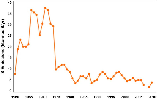 Sulfur pollutants released to the atmosphere in the form of sulfur dioxide and sulfate have contributed to changes in surface water geochemistry [17,20,21]. Impacts spurred policy-makers to enact legislation and created opportunities and technologies to reduce emissions [22,23].