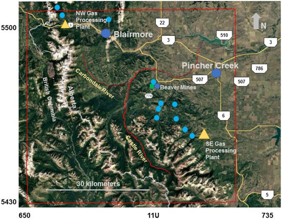 Map (Google Earth) with showing 60 km × 60 km grid encompassing the region modeled (red line) relative to the towns of Blairmore and Pincher Creek and the hamlet of Beaver Mines (blue dots). Sour gas processing facilities (yellow triangles) and locations where co-located tree core and tree needle samples were collected (light blue circles) are shown. The location of the co-located high-volume and low-volume samplers for air quality measurements from 2006 are depicted by a green square. UTM coordinates (km) for Zone 11U are shown.