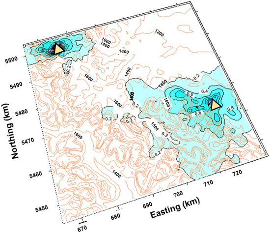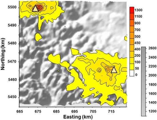 Spatial variations in hourly maximum SO2 concentrations and sulfate deposition are based on the highest concentrations over the modeled year for the Rocky Mountains in southwestern Alberta. Sulfur dioxide from industrial emission sources modeled using CALPuff is seen to be largely confined to the same valley as the processing plant in the northwest with exceedances above air quality limits (red contour) of 450 μg/m3, whereas that from the southeastern facility is largely more dispersed (Figure 4). Unexpectedly, the results do not show a distinct pattern of transport of concentrations of SO2 < 50 μg/m3 to the west and >50 μg/m3 concentrations downwind of the industrial facilities to the east. There is an elongation in the contours for SO2 concentrations between 50 to 400 μg/m3 eastward of the southeast facility, but significant upwind SO2 distribution for the 50 and 100 μg/m3 contours within the valleys to the west as well. This confounds our biomonitoring upwind/downwind sampling design. Instead of moving dominantly eastward, the emissions migrate upslope into the Rocky Mountains west of the gas facility, including into the Castle River drainage during unfavourable (easterly upslope) and downwash conditions [19].