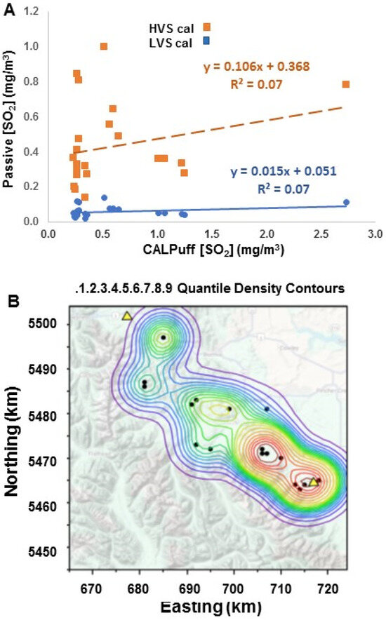 (A). Passive atmospheric S concentrations calibrated to low- (blue, p = 0.00013) and high- (orange, p = 0.27) volume active samplers versus CALPuff annual SO2 concentrations at receptor sites corresponding to passive monitor locations. (B). Interpolated distribution in passive SO2 concentrations (HVS calibration) co-located with passive monitors at 19 passive sampler sites based on paired samplers between October 2006 and March 2007. (kernal smoother = 4, quantile densities are 0, 2.25, 4.08, 5.33, 6.33, 7.75, 9.42, 11.58, 14.58, 16.75, and 18.75 in parts per thousand × 10−4).