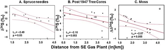 First and second spruce needles (A), as well as the portion of tree cores from pines (B) post-1947 and moss (C), show spatial effects (ln (distance)) with δ34S, as a proxy for sulfur emissions/deposition attributable to industry correlating with distance from the southeast facility (p < 0.1). The moss regression excludes a significant (p < 0.05, Malhaldnobis Distance = 2.1) outlier, circled in the figure. Measurement uncertainties (δ34S ± 0.25‰) are not shown for simplicity.
