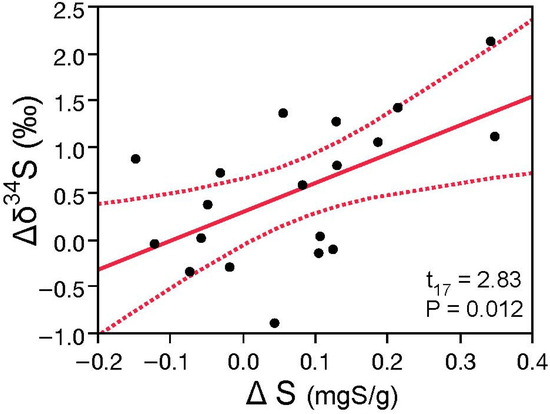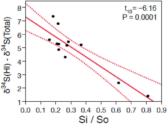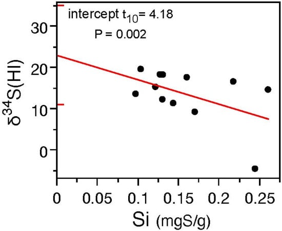To understand these results, it is worthwhile considering how δ34S values in plant tissues and pyrite dissolution may have been altered by industrial sulfur deposition over time. Prior to industrial sulfur emissions, soils and plant tissues are expected to reflect a mix of background atmospheric sulfur (δ34S ~+5‰) and sulfate from pyrite (δ34S ~−18‰). After industrial sulfur emissions impacted the region’s soils and vegetation, sulfur with a δ34S of ~+18‰ (See Figure S6) would become increasingly important, first to just the inorganic sulfur fraction. Over time, this sulfur would be incorporated into tissues and form litterfall and affect the surface litter layer, and then organic horizons. Finally, the lower inorganic soil horizon would progressively demonstrate higher δ34S values reflecting sulfur inputs, which are minimally affected by fractionation during soil sulfur mineralization (<1.5‰, favouring 32S in labile sulfate, [44]). In fact, this is exactly what ([12]; see Figure 7.13 Ram River) demonstrated in an intensive study of plant tissues and soils at a sulfur deposition site in central Alberta. Over time, the difference in isotope composition of the plant tissues (with atmospheric background sulfur δ34S ~+5‰ and industrial sulfur δ34S ~+18‰) and pedogenic sulfur (a mixture of background organic matter (δ34S ~+5‰) and sulfate from mineral dissolution (largely pyrite δ34S ~−18‰)) will converge to some new value that is intermediate to the end-member compositions. Further, the convergent plant tissue and soil δ34S values should be apparent closer to the source of industrial emissions, and in needles that display higher Si/So ratios. As soils develop a lower pH in response to continued atmospheric deposition, less of the mobile soil sulfate in the inorganic sulfur fraction (HI) will be retained in the organic soil layers where roots are located and be unavailable for plant uptake. The ability of soil to buffer acid deposition is measured as the cation exchange capacity (CEC). Figures S1A,B and S2 form a plausible explanation for the relationship seen in Figure 9: inorganic S needle content is lower when the δ34S value of the inorganic sulfur fraction in needles approaches the δ34S value of pollutant sulfur. Here, we posit that high δ34S (HI) in needles associated with a low Si needle concentration indicate high deposition of atmospheric pollutant (Figure 9). Soil sulfur mineralization producing soluble sulfate from organic sulfur turnover in coniferous forest soils is attended by a small sulfur isotope fractionation of <1.5‰, increasing the δ34S of the remaining organic sulfur in soil. This happens as the lighter 32S is mobilized to soluble sulfate, which is more labile, and is exported to lower soil horizons and eventually into the groundwater and surface water leaving the catchment [44]. As sulfur deposition increases, Si/So declines as nutrients including Si are leached from the soil root zone with additional acid deposition (see Figures S1 and S2 and accompanying text). This is a plausible interpretation for the results in Figure 9. At higher levels of atmospheric industrial sulfur deposition, the δ34S for inorganic sulfur in needles increasingly reflects the atmospheric source (the intercept in Figure 9). Over decadal timescales, as the proportion of inorganic-to-organic sulfur increases (higher Si/So), the sulfur incorporated into plant tissues increasingly reflects the effects from the atmospheric deposition source and the difference between the δ34S of total and inorganic sulfur will become increasingly smaller (Δδ34S decreases: Figure 9, Figure 10 and Figure S6). A slope of 0.83 is found when the δ34S values for total sulfur in litter and needles are plotted (r2 = 0.84: see Supplementary Figure S1A) and improves when the total sulfur in needles and sulfate in litter are compared (m = 0.99; r2 = 0.86). As the CEC declines, the litter sulfate δ34S values increase (Figure S2). Together these data suggest that the difference in isotope composition (inorganic—HI) versus Si/So may be a sensitive indicator of pollutant impacts on conifers in locations where atmospheric and pedogenic δ34S values are significantly distinct. The results are consistent with the long-term deposition of industrial sulfur leading to sulfur stress (high Si/So ratios) and a loss of buffering capacity in litter that potentially results in the export of soil organic matter (that retains nutrients within the root layer) downward in the soil column. Trees are able to adapt as roots shift lower in the soil column but discrepancies in the speed at which nutrients are lost in the organic horizons could plausibly affect tree growth.