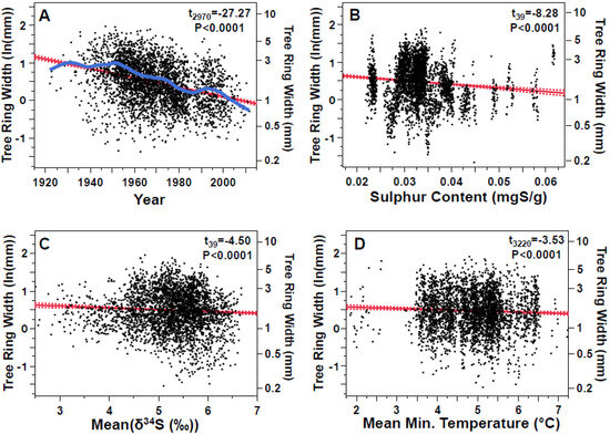 Here we used a mixed-model regression of tree ring width (i.e., radial growth) that included the mean δ34S values as well as sulfur content to test whether the negative effects of sulfur on tree growth could be observed in this study, while also considering the long-term pattern of growth (i.e., year) and the effect of two features of weather experienced during the growing season in the previous year known to affect tree growth: average minimum daily temperature and summed precipitation (both measured in the April to August time period). The model identified the year, sulfur content, mean δ34S, and mean minimum daily air temperature (April to August) for the region as the top four components that explained 29.5% of the variation in ring width. The radial growth rates of trees decreased linearly through the 90-year period of study (Figure 11A), but a spline fit through the adjusted values (the blue line in Figure 11A) shows that the growth rate was roughly constant until around 1950, after which it decreased relatively linearly. Tree growth decreased with increased sulfur content, higher δ34S values, and mean daily minimum temperature (Figure 11B–D). Trees impacted by atmospheric pollutant deposition from industrial sources would be expected to show decreased growth with sulfur content and δ34S in this study, as the organic layer in the soil becomes increasingly impacted (as also hypothesized for tree needles).