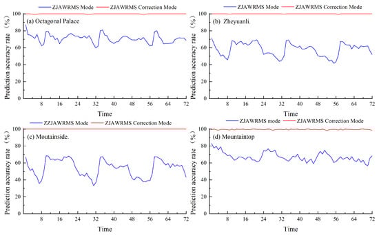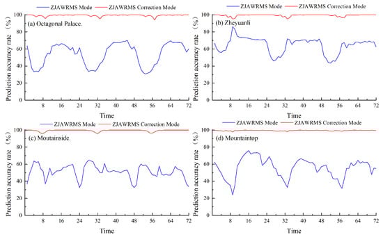 (3) The duration of high accuracy was substantially extended. Prior to correction, Octagonal Palace maintained accuracy above 75% for 11 h, Mountainside for 6 h, and Zheyuanli and Mountaintop for less than 1 h. After correction, all stations maintained accuracy above 85% for the entire 72 h forecast period.