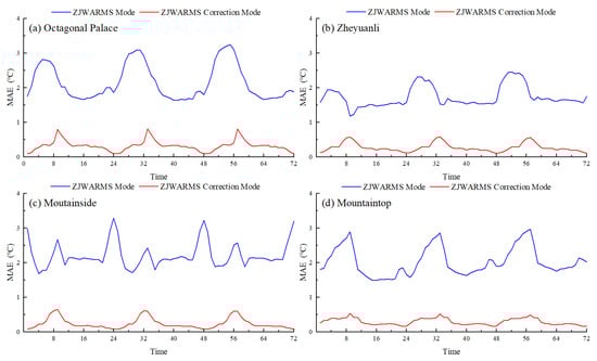 Figure 3. The 72 h temperature forecast MAE for model output and corrected results: (a) Octagonal Palace. (b) Zheyuanli. (c) Mountainside. (d) Mountaintop.