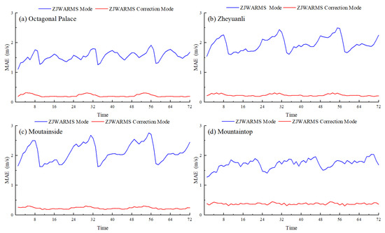 Figure 5. The 72 h wind forecast MAE for model output and corrected results: (a) Octagonal Palace. (b) Zheyuanli. (c) Mountainside. (d) Mountaintop.