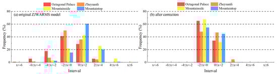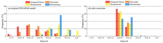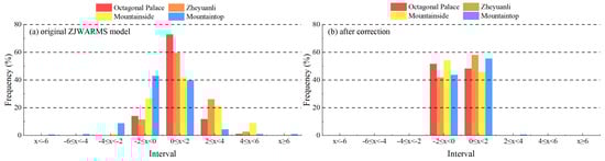 Figure 6. Frequency distribution of forecast error intervals at maximum temperature accuracy: (a) original ZJWARMS model. (b) after correction.