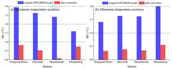 Consistent with these distributional changes, Figure 8 depicts the spread of errors in terms of the standard deviation across the two accuracy periods. At all four stations—Octagonal Palace, Zheyuanli, Mountainside, and Mountaintop—the pre-correction dispersion is greater during the minimum-temperature period, with standard deviations generally ranging from 1.6 to 3.0 °C, distinctly higher than the 1.4 to 1.9 °C observed in the maximum-temperature period. Octagonal Palace and Zheyuanli exhibit the largest values. After correction, the dispersion decreases markedly in both periods: during the maximum-temperature period, values cluster around 0.3 to 0.8 °C, while the minimum-temperature period converges to a comparable range.