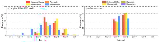 Figure 9. Frequency distribution of forecast error intervals at maximum wind speed accuracy (a) Original ZJWARMS model. (b) After correction.