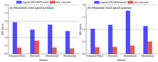 Consistent with the distributional changes described above, Figure 11 depicts the dispersion of wind-speed errors in terms of the standard deviation across the two accuracy periods. Before correction, all four stations—Octagonal Palace, Zheyuanli, Mountainside, and Mountaintop—exhibit greater dispersion during the minimum-wind-speed period, with standard deviations of approximately 1.4–2.0 m/s, compared with about 1.0–1.8 m/s in the maximum-wind-speed period. Variability is more pronounced at the higher-elevation sites, with Mountainside and Mountaintop generally occupying the upper end of the range.