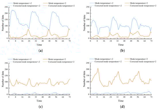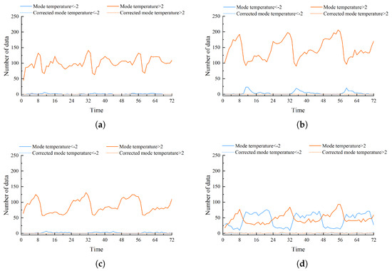 Figure 12. Number of forecast temperature error samples greater than +2 °C and less than −2 °C: (a) Octagonal Palace. (b) Zheyuanli. (c) Mountainside. (d) Mountaintop.