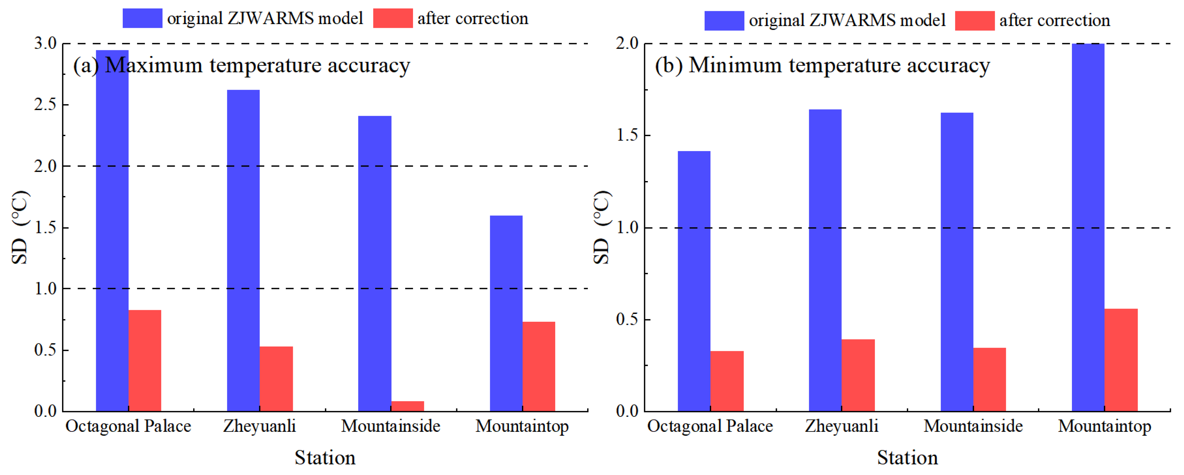 - Error Evaluation:The correction results are assessed using various evaluation metrics, including error (E), RMSE, MAE, and accuracy. Here, “accuracy” denotes a tolerance-based hit rate: a forecast is counted as accurate when the absolute error for 2 m temperature is within 2 °C and the absolute error for 10 m wind speed is within 2 m/s. These thresholds were fixed in advance based on (i) approximate observational/representativeness uncertainty at the stations, (ii) the resolution and decision needs of user-facing products, and (iii) common practice in station-level post-processing. To facilitate international comparisons, we additionally report RMSE, MAE, and skill scores relative to the raw ZJWARMS forecasts.