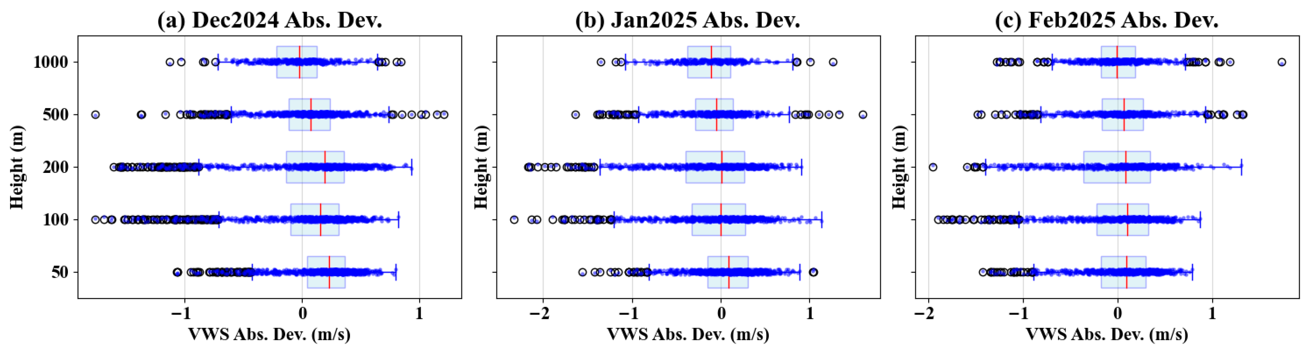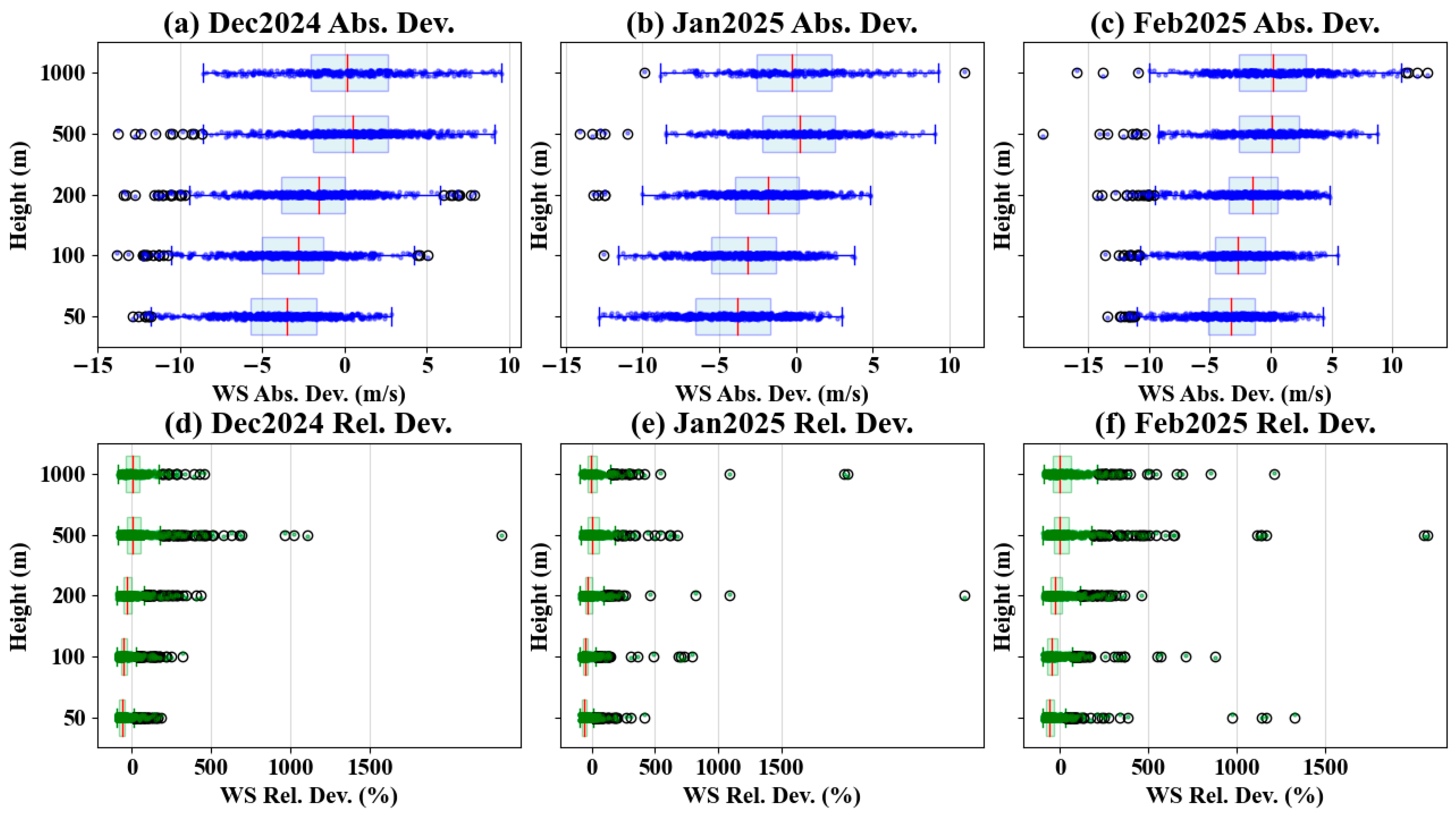 Figure 2d,e), fluctuations in the wind speed baseline result in several notable outliers. Certain altitudes exhibit particularly large deviations, especially in February 2025, where some points reach as low as −15 m/s or as high as 10 m/s. These anomalies may be attributed to extreme weather processes or insufficient simulation of the boundary layer by the model. A comparative analysis of the three months indicates that the overall median error in December 2024 (