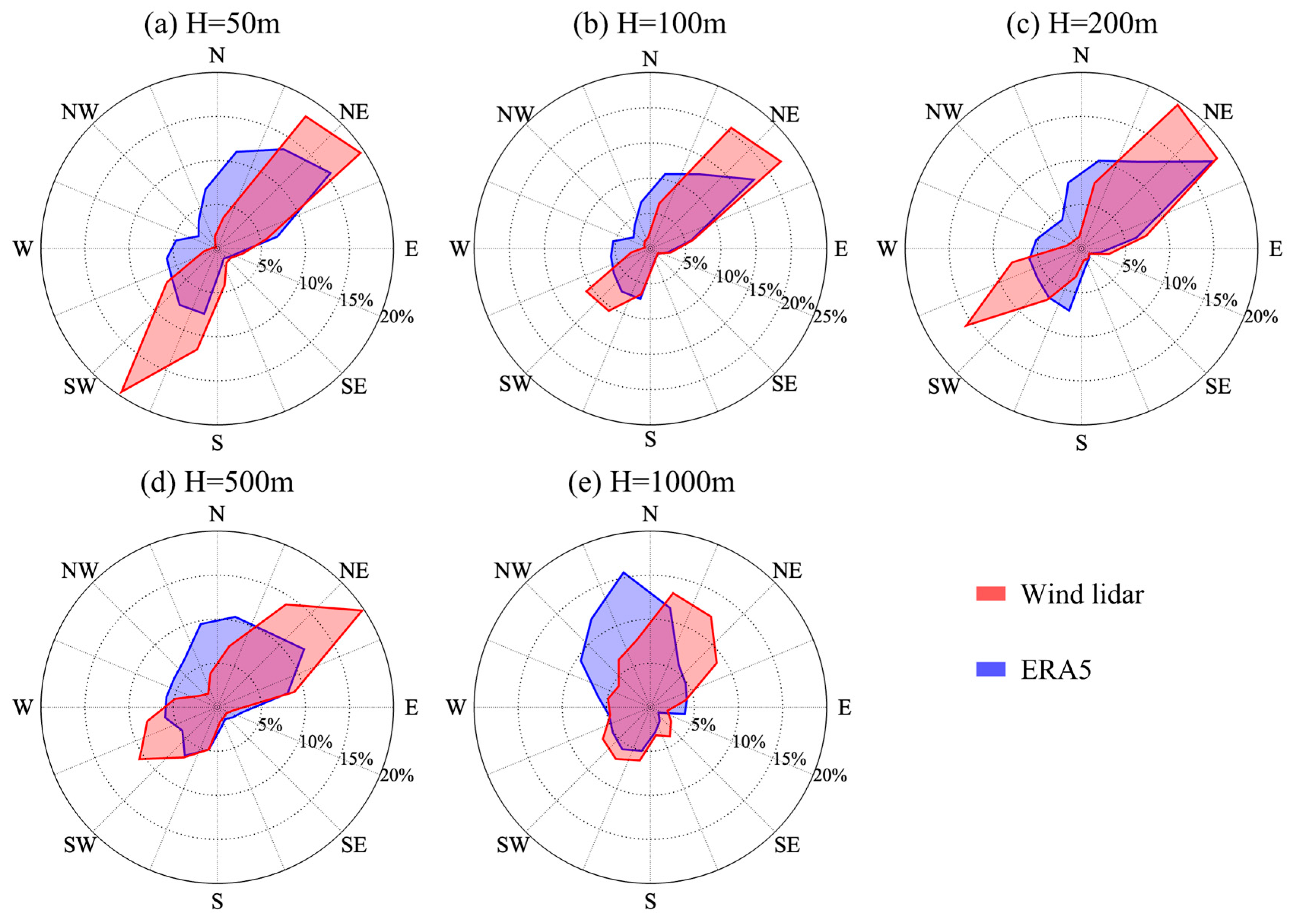 Figure 4a, the wind direction petals of the lidar at 50 m display nearly equal proportions for both northeasterly and southwesterly winds, each constituting approximately 20%. In contrast, ERA5 shows a slightly elevated frequency of northeasterly winds, accounting for around 15%. With increasing heights (from 50 m to 200 m), the observed wind directions become predominantly shifted towards the northeasterly direction, a trend that is similarly observed in the ERA5 wind direction data. At greater altitudes, such as 500 m, the lidar continues to demonstrate a stronger distribution intensity of northeasterly winds, while ERA5 exhibits a more uniform distribution within the northern and eastern ranges. At 1000 m, both datasets exhibit comparable frequency patterns, with peak frequencies of approximately 15%, yet they differ in their peak directions. The lidar measurements indicate a peak around NNE, whereas the ERA5 wind direction peaks around NNW.