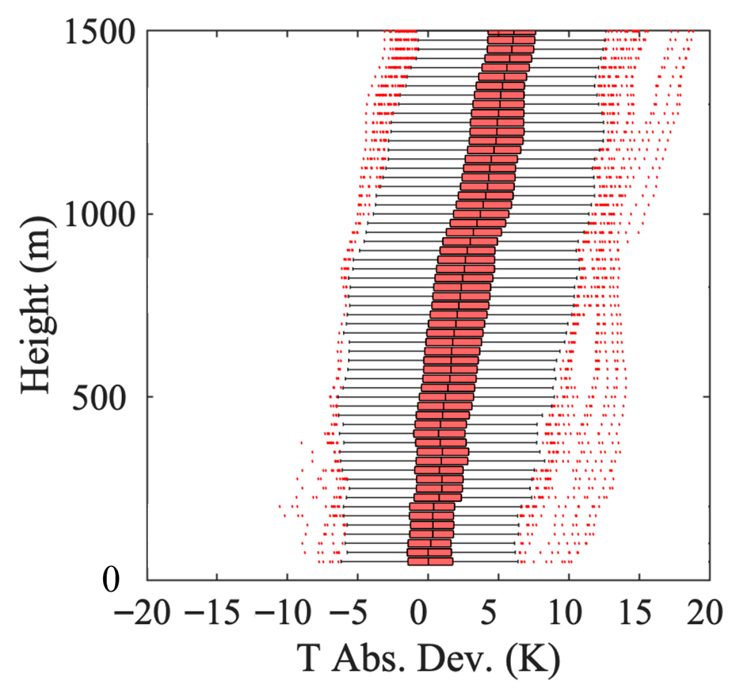 Figure 6 illustrates the vertical profile of the absolute temperature deviation (T Abs. Dev) between MWR observations and ERA5 reanalysis data. There is minimal deviation between the observed temperatures and those from ERA5 within the lower atmospheric layer (0–500 m), indicating that ERA5 accurately represents near-surface temperature conditions. In the altitude range of 500–1500 m, the deviation gradually increases from approximately 0 K to 6.8 K. This suggests that the accuracy of ERA5 in reconstructing temperature decreases progressively with increasing altitude.