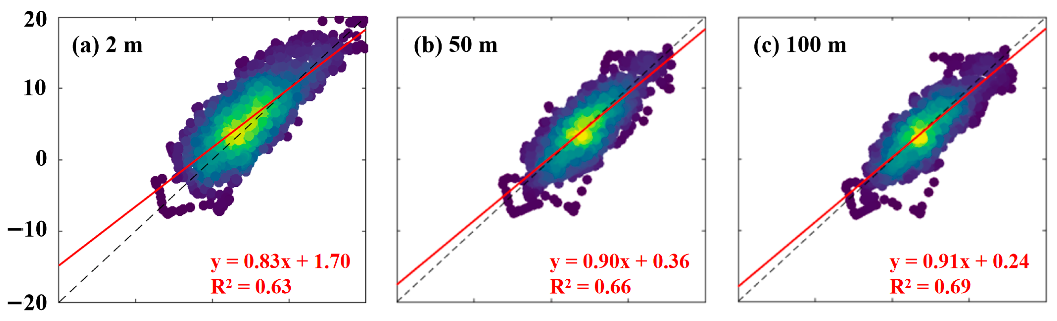 Figure 9a–d), the scatter plots reveal moderate to weak linear relationships. The fitted slopes decrease from 0.65 at 2 m to 0.60 at 200 m, with relatively low R
