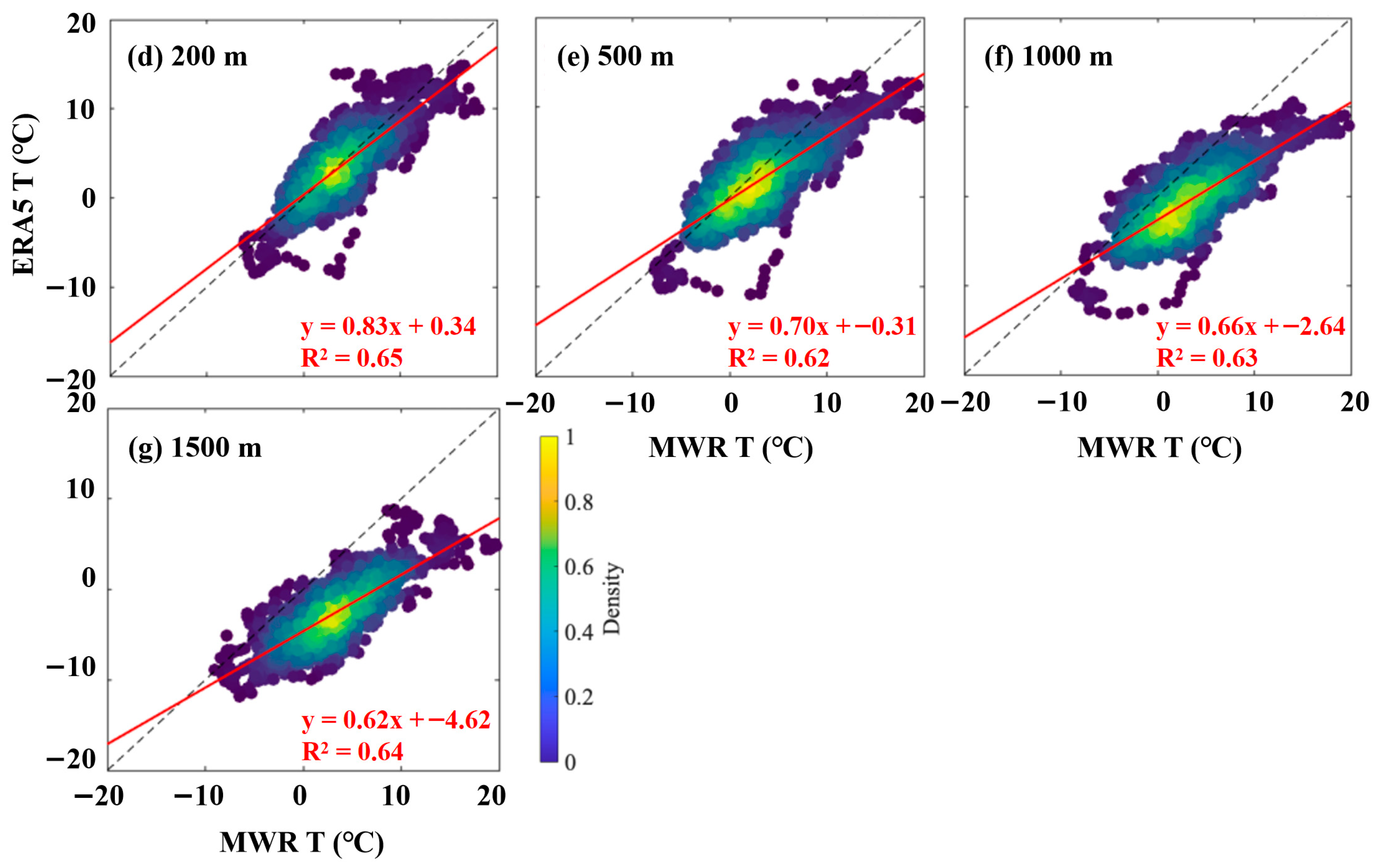 Figure 7 depicts the scatter density relationships between observed temperatures (MWR T) and ERA5 temperatures (ERA5 T) at various heights, quantifying the linear consistency and deviation characteristics between the two datasets across different atmospheric layers. In the lower layers of 2–200 m (