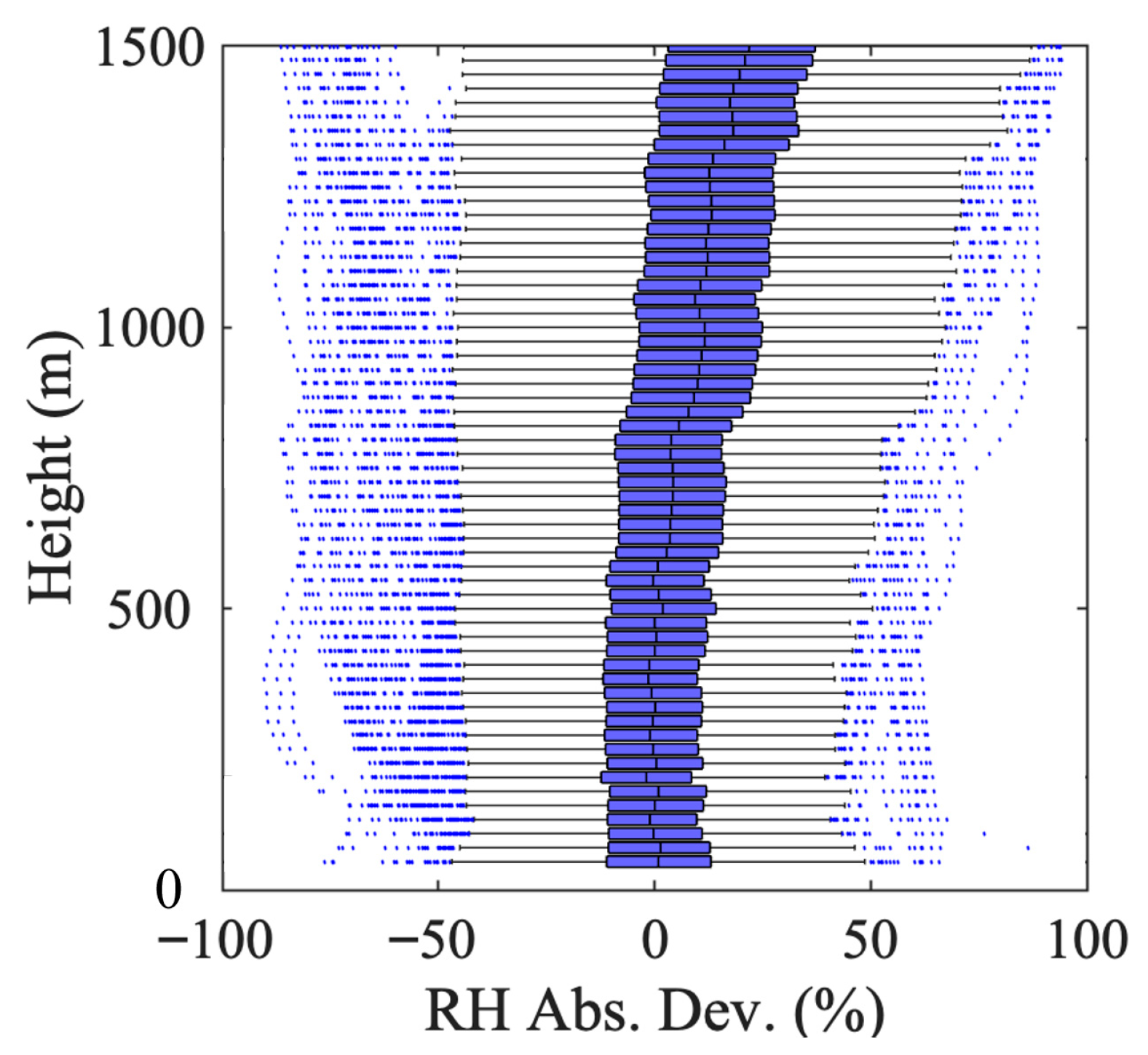 Figure 8 displays the vertical profiles of the absolute relative humidity deviation (RH Abs. Dev) between microwave radiometer (MWR) observations and ERA5 reanalysis data, highlighting the height-dependent discrepancy patterns. The overall absolute deviations between observed and ERA5 relative humidity are more pronounced compared to temperature deviations. This discrepancy can be attributed to factors such as reduced observation density in the reanalysis assimilation at higher levels and limitations in ERA5 moist parameterizations. As altitude increases, ERA5 tends to diverge more significantly from MWR observations. Near the surface (0–300 m), the deviations are relatively small and concentrated around 0%, suggesting a moderate agreement between MWR observations and ERA5 data. However, starting from 300 m upward, the deviation range noticeably broadens, with the spread of deviations increasing progressively with height. Notably, at levels above 800 m, the distribution of absolute deviations becomes substantially wider, with individual values reaching beyond ±50%. In the near-surface layer (0–300 m), the deviation distribution remains relatively symmetric and narrow, indicating that ERA5 provides reasonably reliable estimates of relative humidity near the ground. Conversely, above 1000 m, the deviation patterns become increasingly asymmetric and scattered, with broader ranges on both the positive and negative sides. This suggests that ERA5 encounters challenges in accurately capturing the variability in humidity in the free atmosphere, likely due to the combined effects of weaker observational constraints and more complex moisture structures aloft.