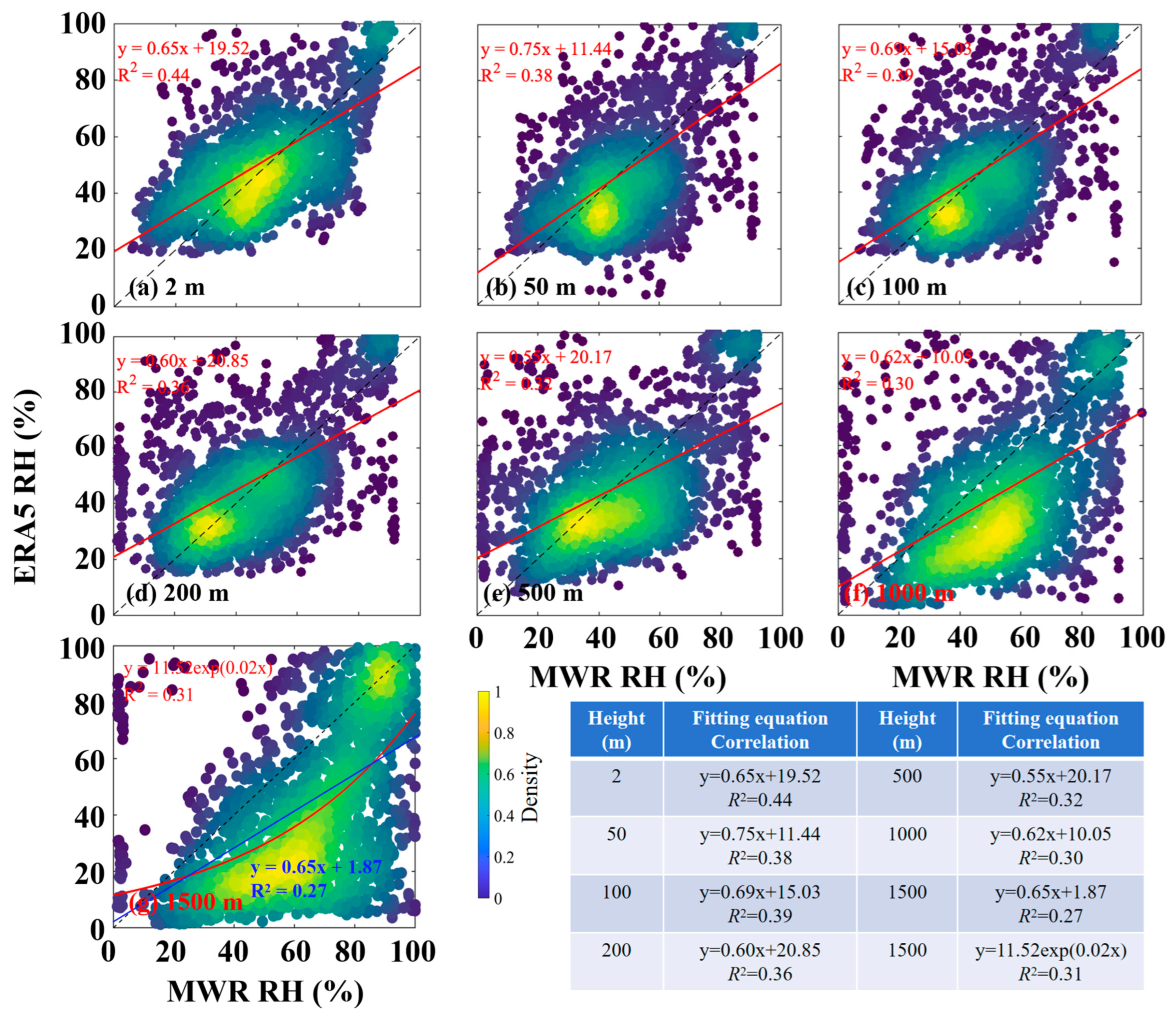 2 = 0.27). This improvement can be largely attributed to the nonlinear increase in ERA5 RH under moderately to highly humid conditions, where ERA5 tends to overestimate RH more rapidly than MWR observations. A noticeable change in the distribution density and slope of the fitted curve occurs around an MWR RH value of 60%, suggesting the presence of a “turning point”. This phenomenon may be associated with the proximity of this layer to the top of the planetary boundary layer or the base of low-level clouds, where significant moisture gradients and cloud formation processes are prevalent. In such conditions, ERA5 RH is more strongly influenced by model parameterizations (e.g., condensation and vertical mixing), whereas the MWR provides more localized and sensitive measurements. Consequently, the exponential function better captures the accelerated increase in ERA5 RH under high-humidity conditions, thereby offering a more realistic depiction of the relationship between the two datasets.
