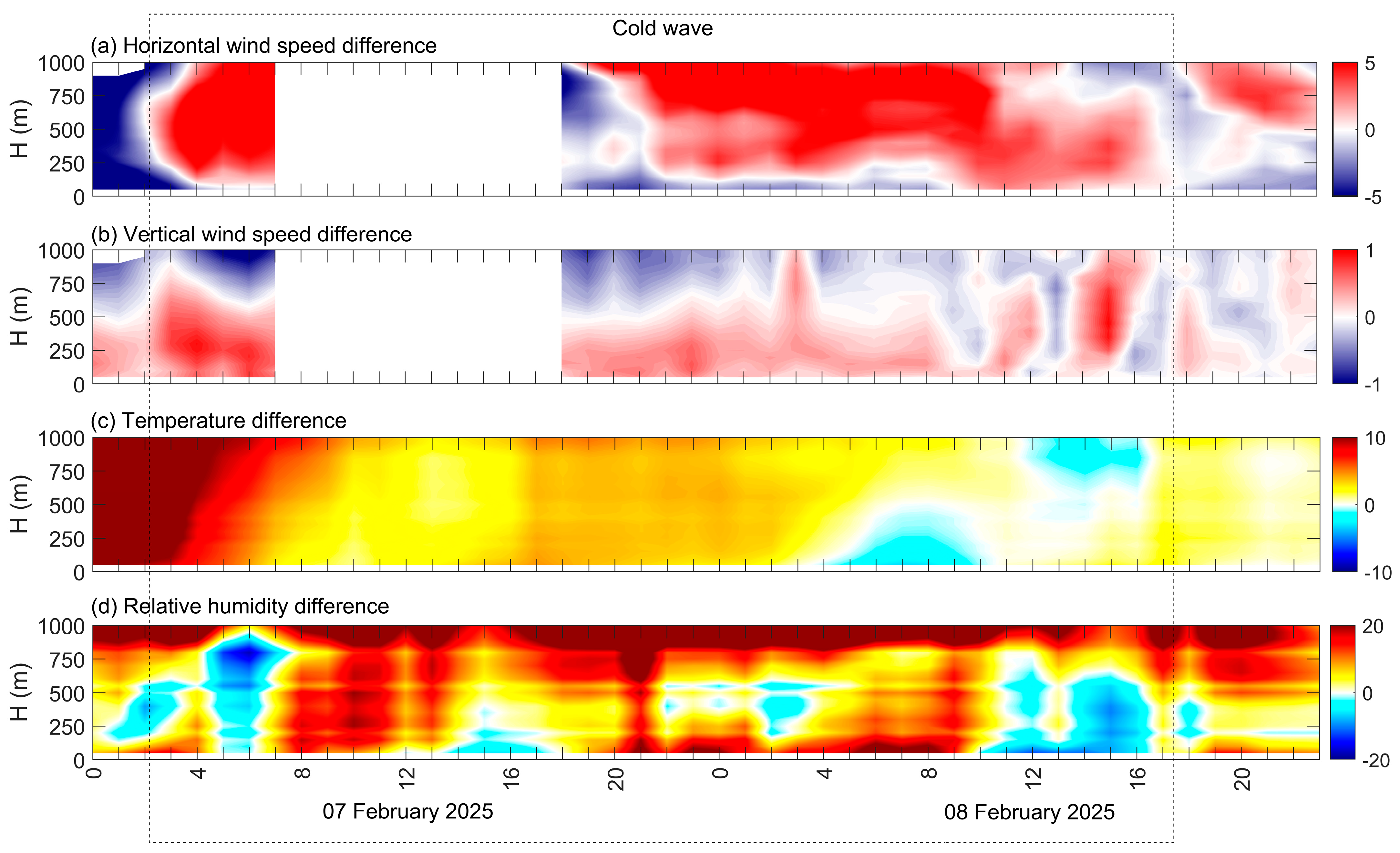 During 7–8 February 2025, a severe cold event hit this region, resulting in abrupt alterations in various meteorological variables. During this cold event, a strong closed low-pressure system was present at the 500 hPa altitude in the eastern part of Inner Mongolia, and a transversal trough extended in the east–west direction. There was a cold high-pressure system from the Baikal Lake to the central region of Mongolia, and the pressure in North China was relatively low, forming a large pressure gradient. This combination of the high-pressure trough in the upper atmosphere and the cold high-pressure system on the ground led to the occurrence of this cold wave [