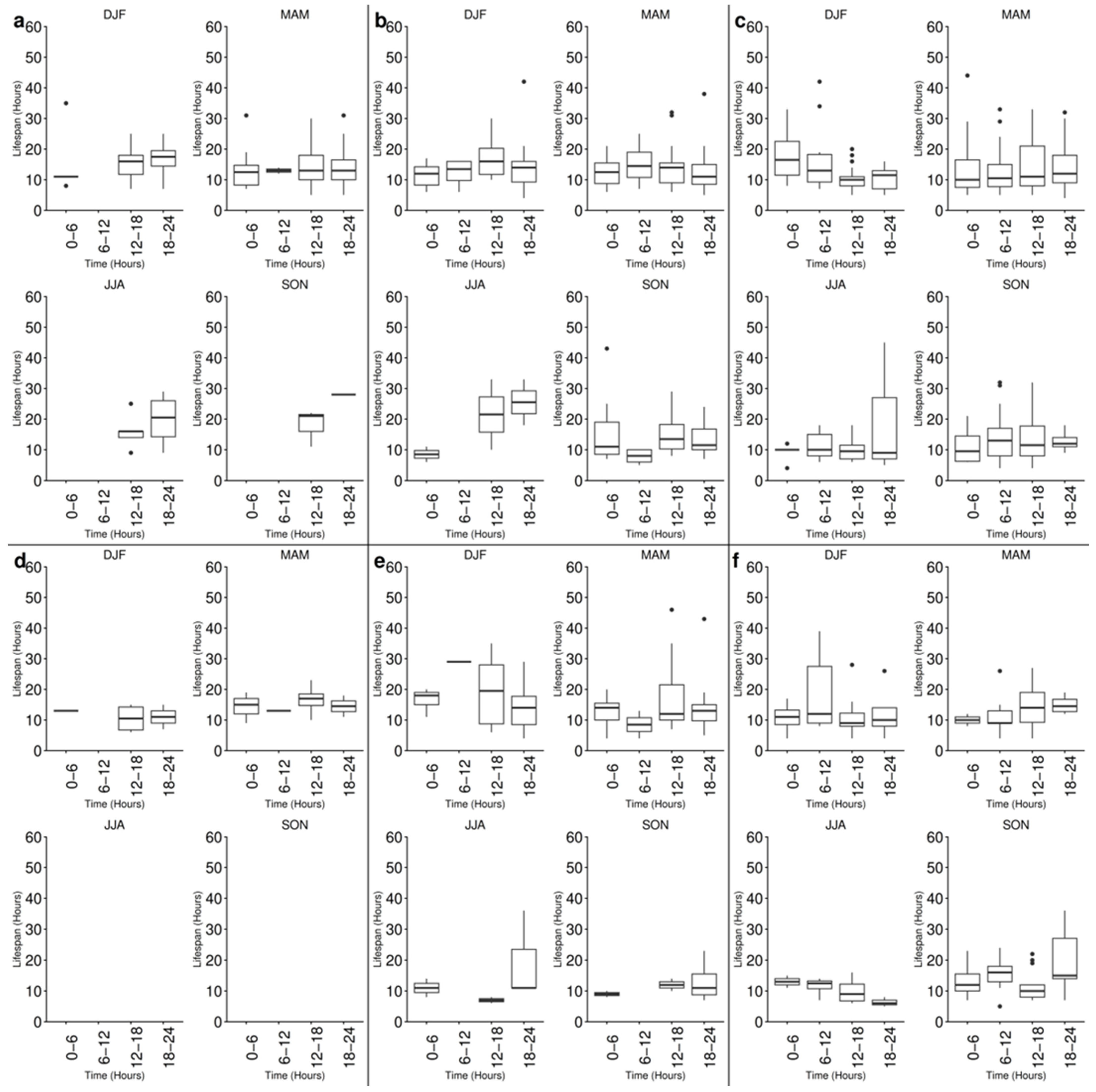 3.2.3. Duration of MCS as a Function of Time of Occurrence and Station