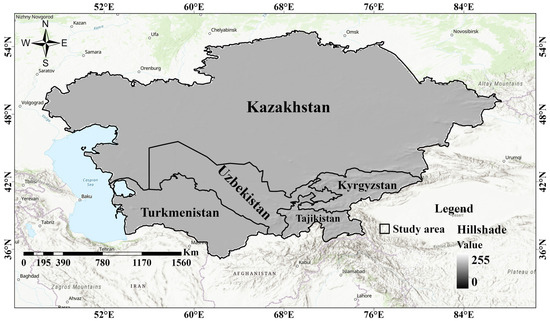 Central Asia, comprising Kazakhstan, Kyrgyzstan, Tajikistan, Turkmenistan, and Uzbekistan, is a vast landlocked region situated within the heart of the Eurasian continent (Figure 1). Its continental climate—with extreme temperature fluctuations—is shaped by its distance from the ocean, strong seasonal contrasts, and diverse orography [64]. The region spans semi-arid steppes, arid deserts, and high-altitude mountain zones such as the Tian Shan, Pamir, and Alai ranges. Annual precipitation varies widely—from less than 100 mm in low deserts to several hundred millimeters in foothills and upland areas—peaking in early spring and declining sharply toward summer. Climatically, Central Asia is recognized as one of the most rapidly warming regions globally, with its summers becoming hotter and longer, and its winters experiencing shortening periods of freezing conditions. Specifically, Kazakhstan has undergone an average warming rate of approximately 0.31 °C per decade from 1950 to 2020 [64]. Documented heatwaves in the region increased significantly between 1981 and 2020, particularly in the eastern and southwestern zones, where both intensity and duration have risen steadily [65]. These conditions exacerbate soil moisture depletion, triggering compound drought–heatwave events whose agricultural and hydrological consequences are amplified.