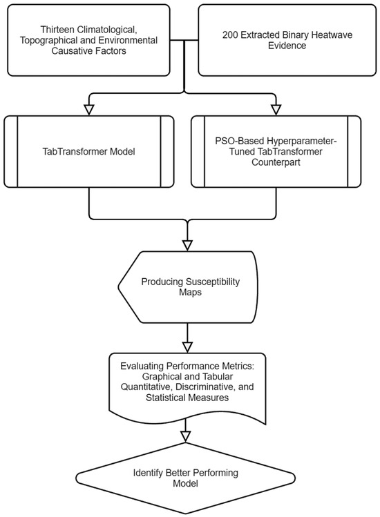 The approach emphasizes full remote sensing dependency, from generating the evidence layer of past heatwave occurrences to extracting the causative factors, ensuring consistency, scalability, and applicability over vast and diverse landscapes. The workflow involves five main stages: (1) extraction of a binary heatwave evidence layer using satellite-derived ERA5 atmospheric reanalysis dataset, (2) selection and preprocessing of key environmental and anthropogenic causative factors from multi-source remote sensing data, (3) construction of a TabTransformer model tailored to capture complex patterns in structured geospatial inputs, (4) optimization of model hyperparameters via PSO, and (5) production of a continuous susceptibility map indicating the spatial probability of future heatwave exposure. A key component of the study is the comparative analysis between the standalone TabTransformer model and its PSO-coupled counterpart, aiming to assess the impact of automated hyperparameter tuning on predictive performance. The use of TabTransformer allows for nuanced representation of variable interactions through attention mechanisms, while PSO ensures efficient and effective model calibration. Together, they provide a robust analytical backbone for heatwave risk prediction, enabling the generation of scientifically grounded, spatially explicit susceptibility outputs to inform climate adaptation and regional planning efforts.