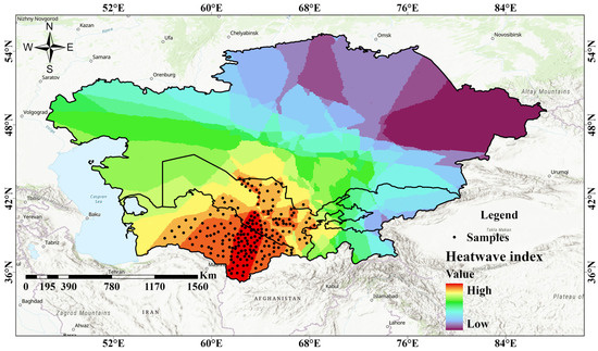To construct the binary evidence layer required for supervised modeling, this study utilized the Heat Wave Index (HWI) derived from the ERA5 reanalysis dataset, accessed through the World Bank Climate Knowledge Portal (https://climateknowledgeportal.worldbank.org/; accessed on 20 June 2025) (Figure 3) [15]. ERA5 provides hourly global atmospheric reanalysis data at a spatial resolution of approximately 31 km (~0.25°), making it a reliable source for identifying extreme temperature events over multi-decadal periods. The dataset is produced by the European Centre for Medium-Range Weather Forecasts (ECMWF) through the assimilation of a wide range of satellite observations—including those from NOAA polar orbiters, Meteosat geostationary satellites, and instruments such as ATOVS—alongside in situ measurements and other conventional observations into a global numerical weather prediction model [67,68,69,70]. This multi-source integration corrects for observational gaps, ensures spatial consistency, and yields data products validated against independent reference networks, providing high accuracy for variables such as temperature, humidity, and wind. The hourly temporal sampling captures diurnal and synoptic variability critical for heatwave identification, while the 31 km resolution enables robust regional-scale mapping. Our study period spans 1991–2020, covering three decades of climate variability across Central Asia, during which heatwave events were identified based on exceedance of temperature thresholds sustained over consecutive days, consistent with established climatological definitions. Heatwave occurrences were identified when temperatures exceeded threshold values for consecutive days, following established climatological definitions. In this study, the Heat Wave Index (HWI) was derived from ERA5 daily maximum 2 m temperature fields (). Following commonly adopted climatological practice [56,59], a heatwave was defined as a period of ≥3 consecutive days where exceeded the 90th percentile () of daily maximum temperatures for the corresponding calendar day, calculated over a 30-year baseline (1991–2020) for each grid cell. The binary HWI for day was computed as (Equation (1)):