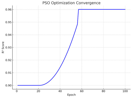 PSO convergence curve showing R2 score improvement over 100 iterations.
