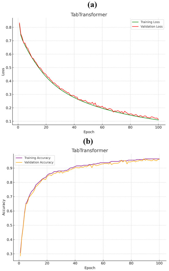 Loss (a) and accuracy plots (b) over training epochs (learning progression) in the TabTransformer model.