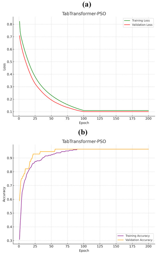 Throughout the training process, we systematically recorded and visualized the progression of loss and classification accuracy for both training and validation datasets. Loss curves, derived from the binary cross-entropy function, reflect how effectively the model minimizes misclassification risk over epochs, while accuracy curves indicate the proportion of correctly classified samples as learning progresses. These plots enable the monitoring of convergence speed, the stability of learning, and the detection of overfitting or underfitting behaviors by highlighting divergence or plateauing trends between training and validation stages. The comparative analysis of these trajectories for the default and PSO-optimized TabTransformer directly informed conclusions regarding the efficacy and regularization impact of hyperparameter optimization.