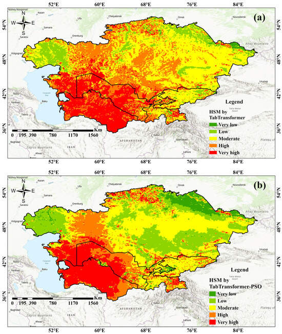 Comparing the two outputs, the TabTransformer map (a) tends to depict broader swathes of high and very high susceptibility, with somewhat diffused transitions between classes, particularly across western Uzbekistan and Turkmenistan as well as the Kazakh steppe margin. The TabTransformer–PSO model (b), however, demonstrates more spatial precision: susceptible zones, especially those marked as “very high,” appear more concentrated in the south and southwest, while moderate and low-susceptibility regions expand in the north and east. This results in a more nuanced, stratified pattern that enhances the interpretability and operational utility of the susceptibility delineation. Critically, the PSO-optimized model reduces the “bleed” of high-susceptibility predictions into peripheral zones, aligning more closely with environmental realities and known climatic trends within Central Asia.