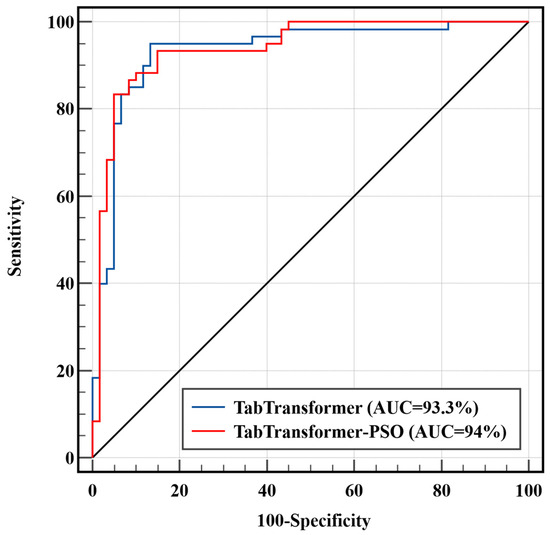 ROC curves and AUC values comparing the classification performance of TabTransformer and TabTransformer–PSO models on the test set.