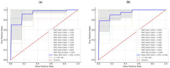 ROC curves for the 10-fold cross-validation of (a) TabTransformer and (b) TabTransformer–PSO models. Thin colored lines represent individual folds, the thick blue line shows the mean ROC curve, and the shaded region marks ± 1 SD. The dashed red line indicates the no-skill classifier (AUC = 0.5).