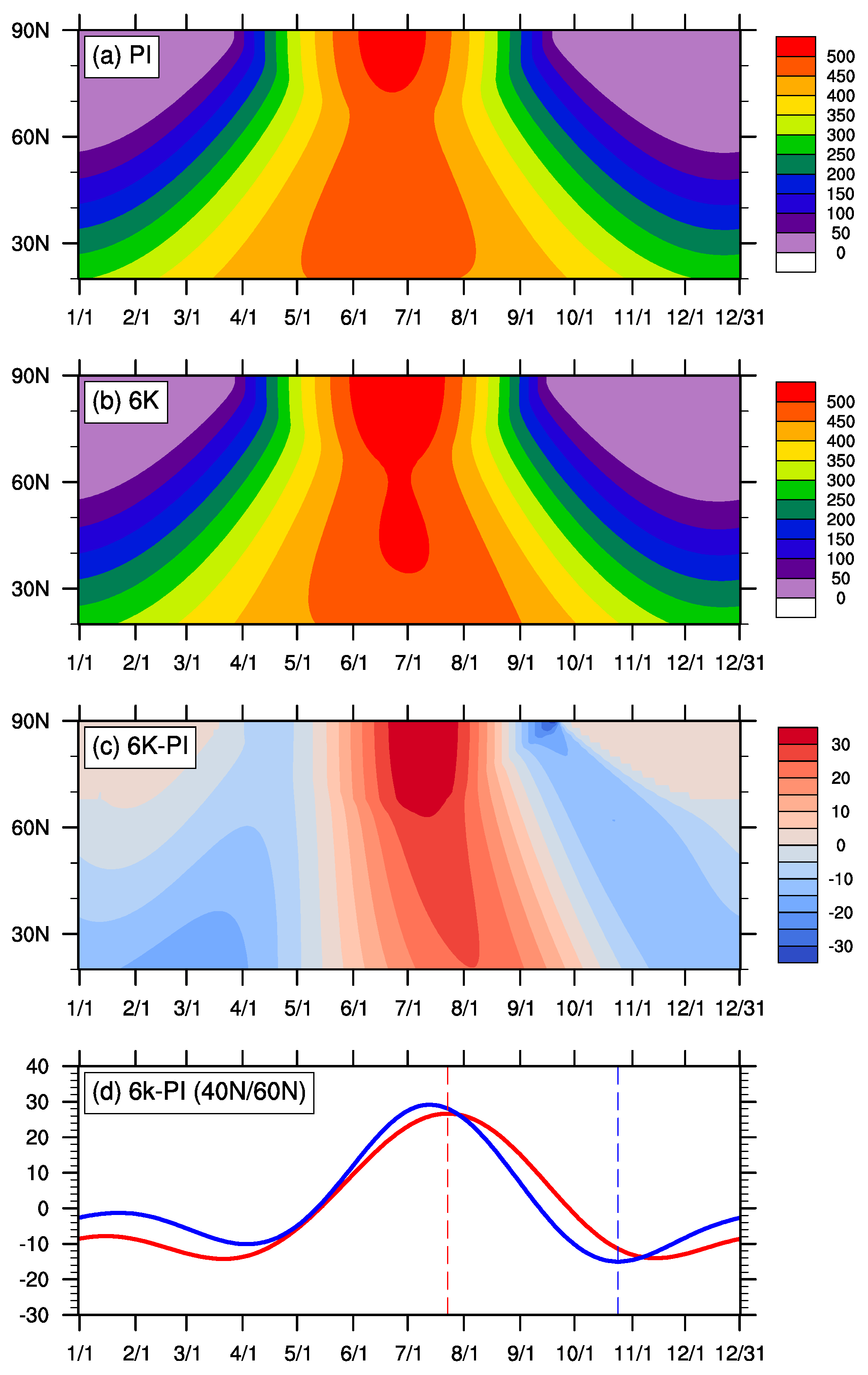 - Donohoe, A.; Dawson, E.; McMurdie, L.; Battisti, D.S.; Rhines, A. Seasonal asymmetries in the lag between insolation and surface temperature. J. Clim. 2020, 33, 3921–3945. [Google Scholar] [CrossRef]