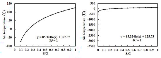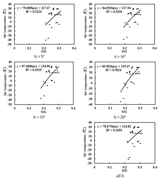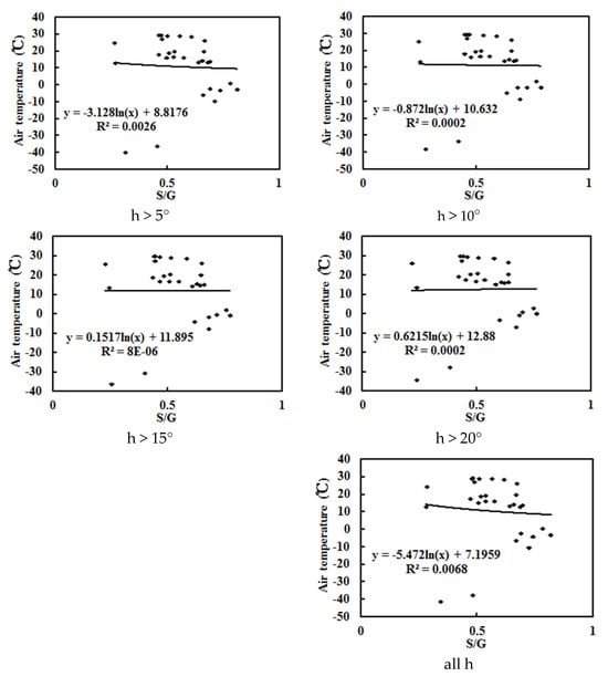 where T is the air temperature and S/G is the ratio of diffuse solar radiation to global solar radiation. This equation was applied to estimate the air temperature. The result is shown in Figure 5. The minimum T of −273.15 ◦C (absolute zero) can be achieved when S/G decreased to 0.009327, which is in good agreement with the 0.009251 value determined using a similar equation at four typical stations (Sodankylä, Dome C, Ankara, and Qianyanzhou) []. The air temperature inferred using more representative BSRN stations over multiple years is also in good agreement with the absolute zero in thermodynamics. It represents very low GLP loads and a clean atmosphere, i.e., a highly idealized state on the Earth.