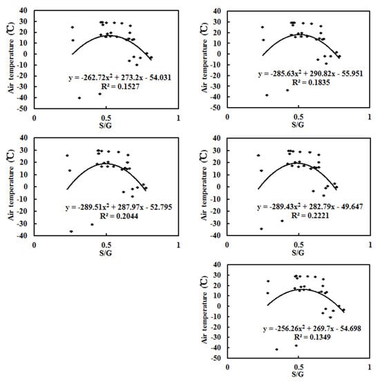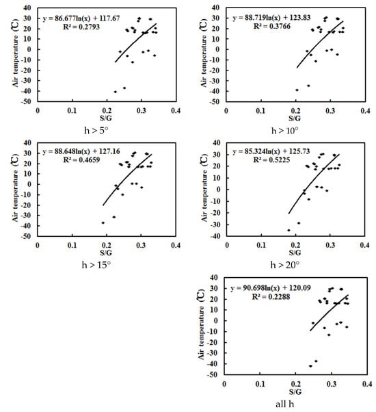 To thoroughly understand the complicated mechanism between T and S/G, further investigations were conducted using polynomial fitting for the relationship between T and S/G at 29 stations under all skies. The results are shown in Figure 4. The correlations between T and S/G increased with the solar altitude from 5° to 20°, and were larger than the corresponding values in Section 3.2. This reveals that there were two ways in which air temperature changed—air temperature increased with the increase in S/G when S/G < 0.5, and decreased with the increase in S/G when S/G > 0.5, indicating that atmospheric substances play the crucial and controlling roles in air temperature and its change—through the storage of solar energy in the atmosphere and through its usage: (1) most of the solar energy were used to heat the atmosphere at low-S/G conditions, while (2) most of them were consumed by GLPs in CPRs via different ways (discussed in the above sections) and were not fully used to heat the atmosphere at high-S/G conditions. It is evident that the S/G = 0.5 is a turning point/balance point in controlling the relationship between T and S/G from positive to negative. Based on the above, it can be recognized that the air temperature decreases (climate cooling) at some sites and regions, due to the high atmospheric substance content (high S/G); in contrast, air temperature increases at the two polar regions because they have the low atmospheric substance contents with S/Gs of 0.59 and 0.31 for the Sodankylä and Dome C stations, respectively []. Furthermore, it is natural and reasonable that the air temperature increases in some regions and decreases in other regions on the Earth.