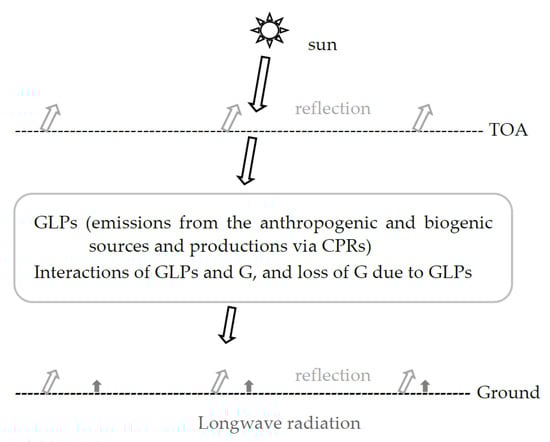 To summarize the above, some GLPs exhibit absorption in the UV and visible regions, the others without absorption properties can use the energy indirectly via CPRs with OH, HO2, NO2* radicals, H2O, and the substances exhibiting absorption. Namely, almost all GLPs absorb, transfer, and utilize UV, visible, and near-infrared (NIR) energy through different ways/mechanisms (Equation (3)). The most important thing to emphasize is that the OH and NO2* radicals play the key roles in CPRs in a single phase of a gas, liquid, and particle, and their connections/conversions. Additionally, water vapor plays vital roles in the production of OH and NO2* radicals, as well as in IR absorption. The absorbing loss/attenuation of global solar radiation in the atmosphere in the total loss caused by the absorbing GLPs plays a dominant role at some typical regional and global sites, such as in the three polar regions, at a medium latitude (Ankara province), a low-latitude (Qianyanzhou) site (the contributions of absorbing loss to total loss range from 62.0% at Sodankylä to 95.5% at Dome C) [,,,,], and in Greece [] (43 stations, 35.1–41.5° N), revealing that the absorbing GLPs are predominant in the total GLPs and result in dominant absorption loss in the atmosphere as a heating source in the above regions (48 stations), which is the dominant reason why we control the emissions of the main GHGs (CO2, CH4, N2O, etc.). Furthermore, the scattering loss of global solar radiation plays secondary roles and also contributes to energy utilization in the atmosphere–land system. Therefore, the atmospheric compositions obey the basic law during their changes (Equation (3)).